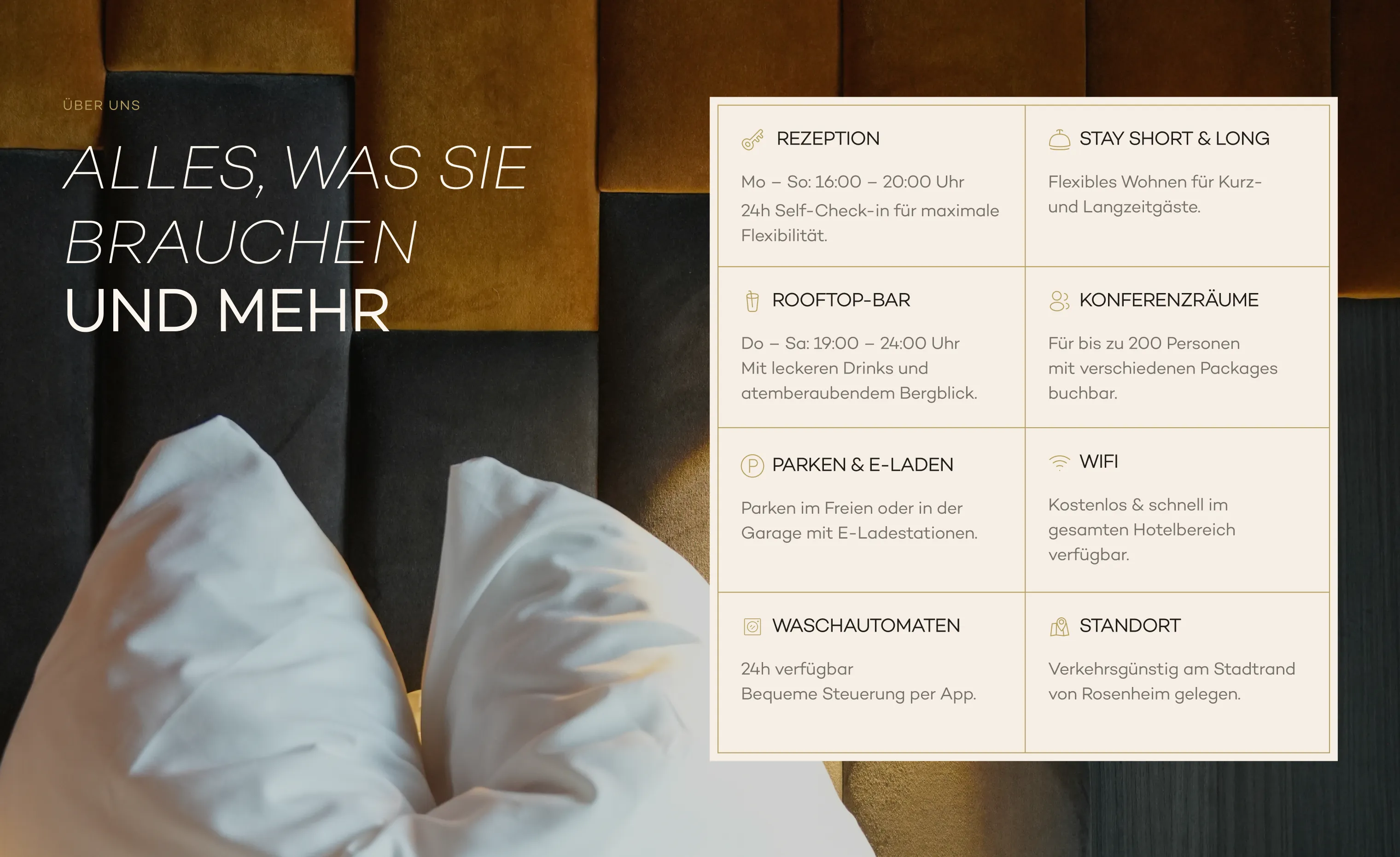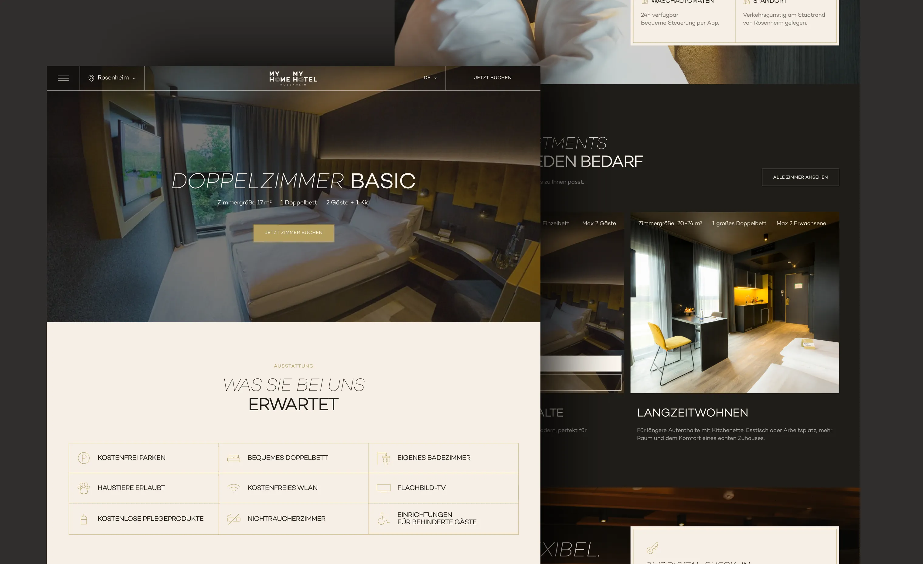 Gleichzeitig sollte die Website sowohl die emotionale Seite des Aufenthalts als auch die geschäftliche Perspektive der Hotelmarke abbilden. Wir entwickelten eine klare Informationsarchitektur, die das Hotelerlebnis, Zimmer und Services mit den relevanten Business-Informationen, Buchungsoptionen und digitalen Touchpoints verbindet.
